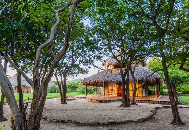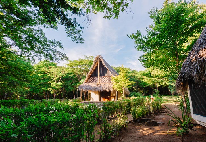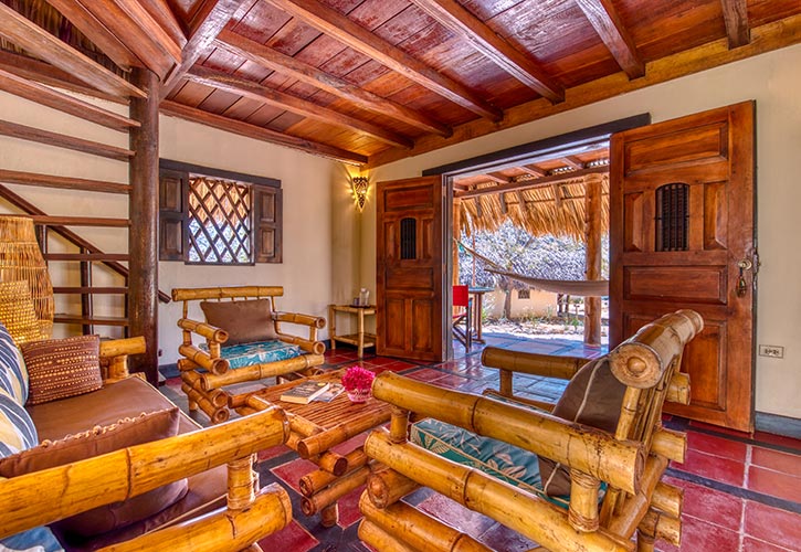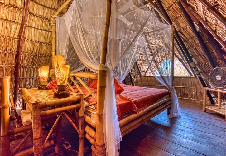 Diese Bungalows liegen direkt am Wald und bieten daher eine spektakuläre Aussicht. Sie verfügen über 1 oder 2 Schlafzimmer mit privatem Balkon (ein Queen-Size-Bett und 2 Einzelbetten), Ventilatoren, Moskitonetze, Schrank, Telefon, Wohnzimmer, vordere Terrasse mit großer Hängematte und ein privates Badezimmer inmitten eines wunderschönen tropischen Gartens mit Außendusche.